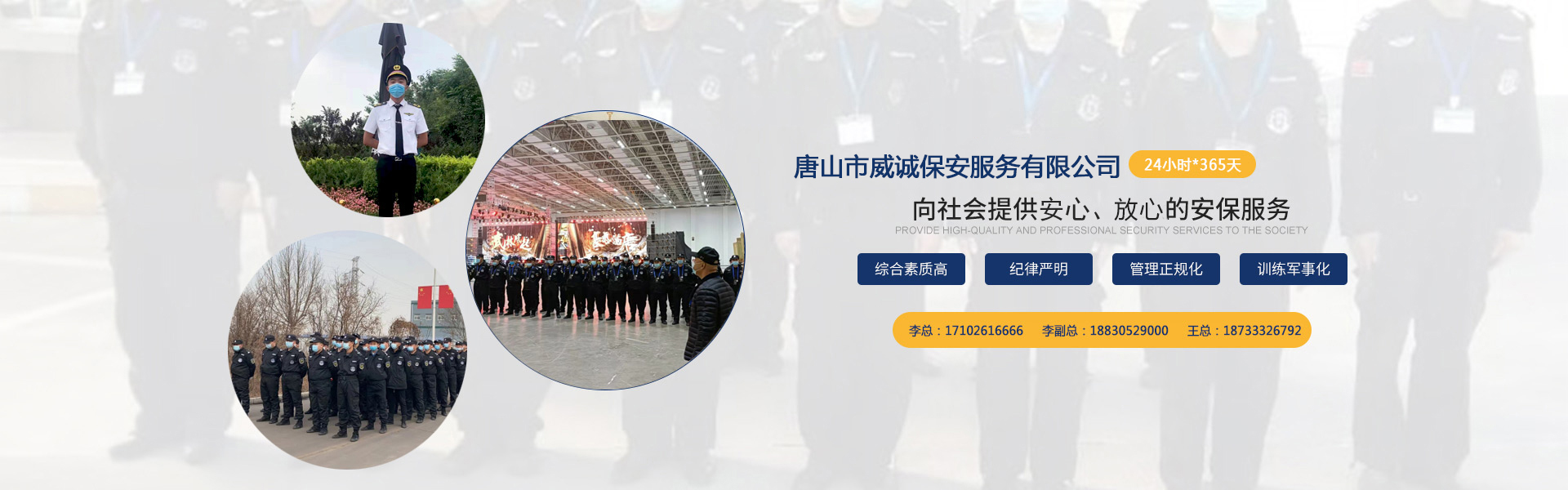唐山市威誠(chéng)保安服務(wù)有限公司自成立以來以“嚴(yán)防死守、忠于業(yè)主”為服務(wù)原則,以“客戶滿意、 合作共贏”為根本目標(biāo)。以科學(xué)的管理、多方位多層次的服務(wù),建立了首問責(zé)任制,完善了走訪、回訪 、滿意度調(diào)查、末位淘汰的預(yù)警管理,不斷提高服務(wù)質(zhì)量,提高業(yè)主滿意度,提高企業(yè)形象。秉承“誠(chéng) 實(shí)守信,紀(jì)律嚴(yán)明,團(tuán)結(jié)協(xié)作,致精致誠(chéng)”的服務(wù)理念,為客戶提供高品質(zhì)、多方位、專業(yè)化的保安服務(wù)。 本公司制定了嚴(yán)謹(jǐn)?shù)亩ㄏ蛘猩徢芭嘤?xùn)、考核錄用、崗中培訓(xùn)、持續(xù)培訓(xùn)、末位淘汰制等一整套完善的管理體系。可以根據(jù)客戶的要求實(shí)地勘察評(píng)估,以量身定做的方式提供安保防范服務(wù)。